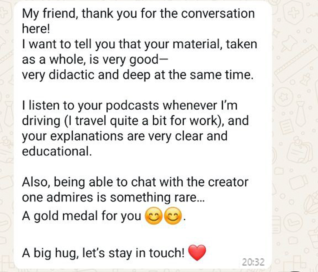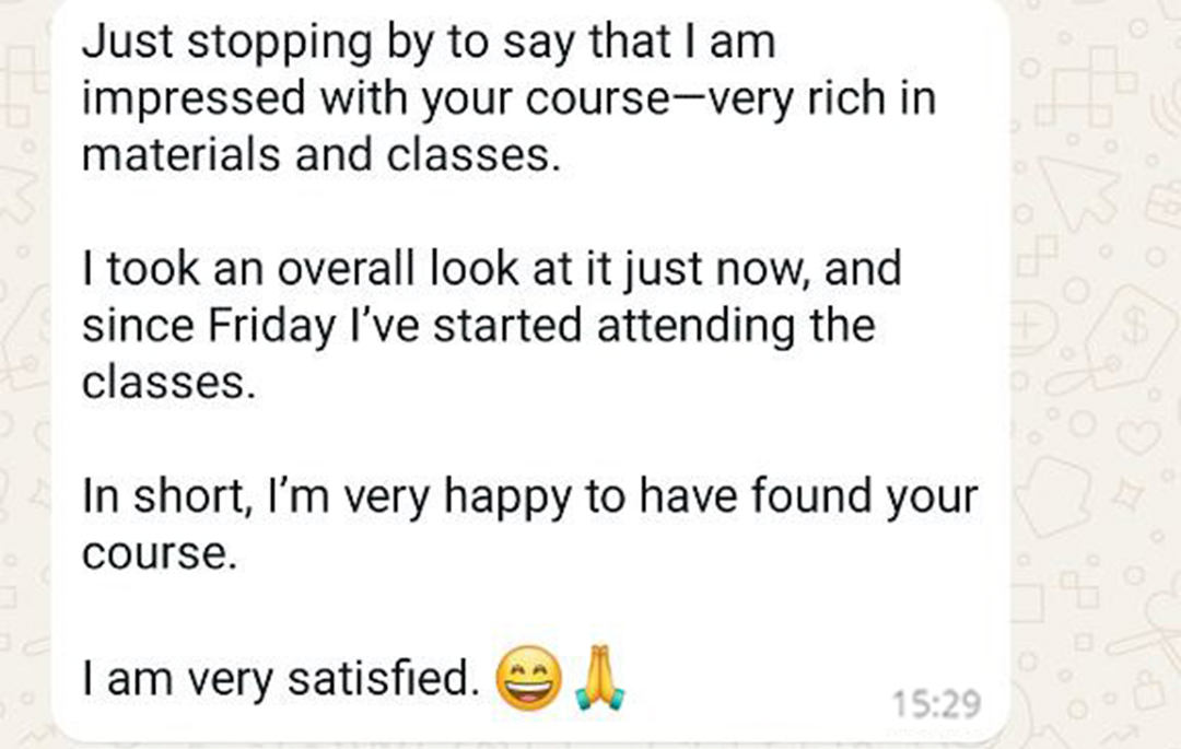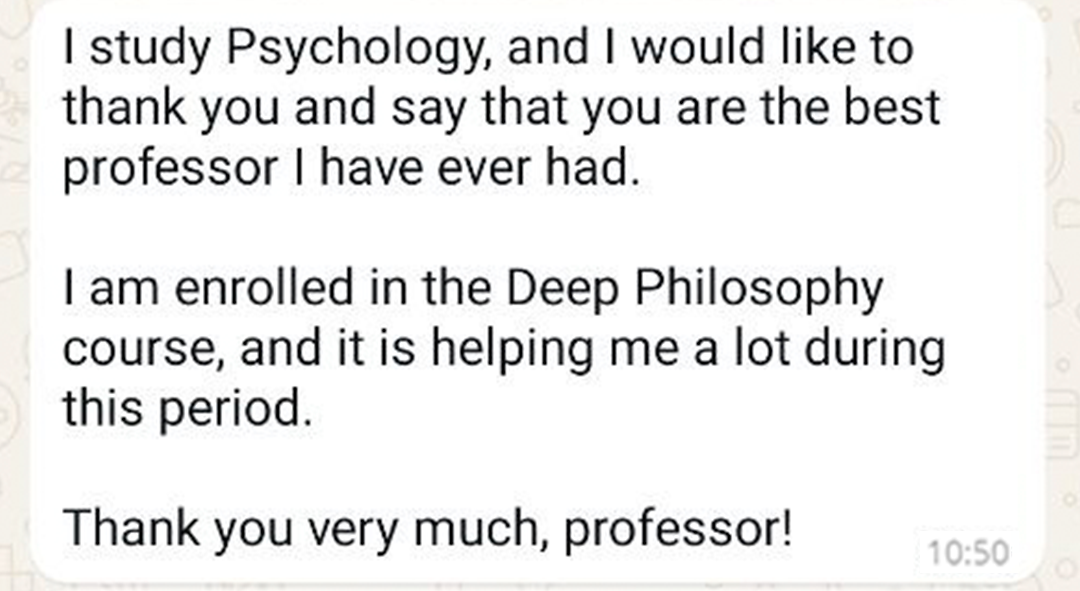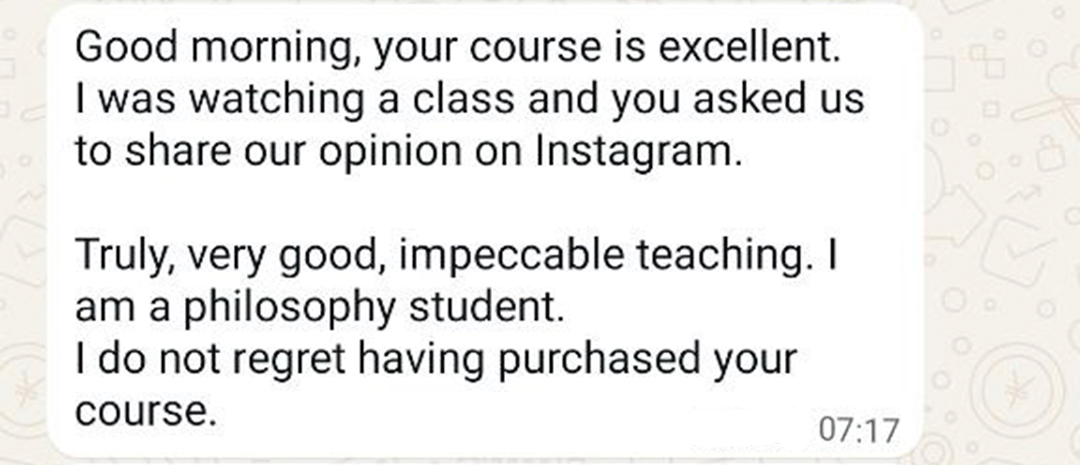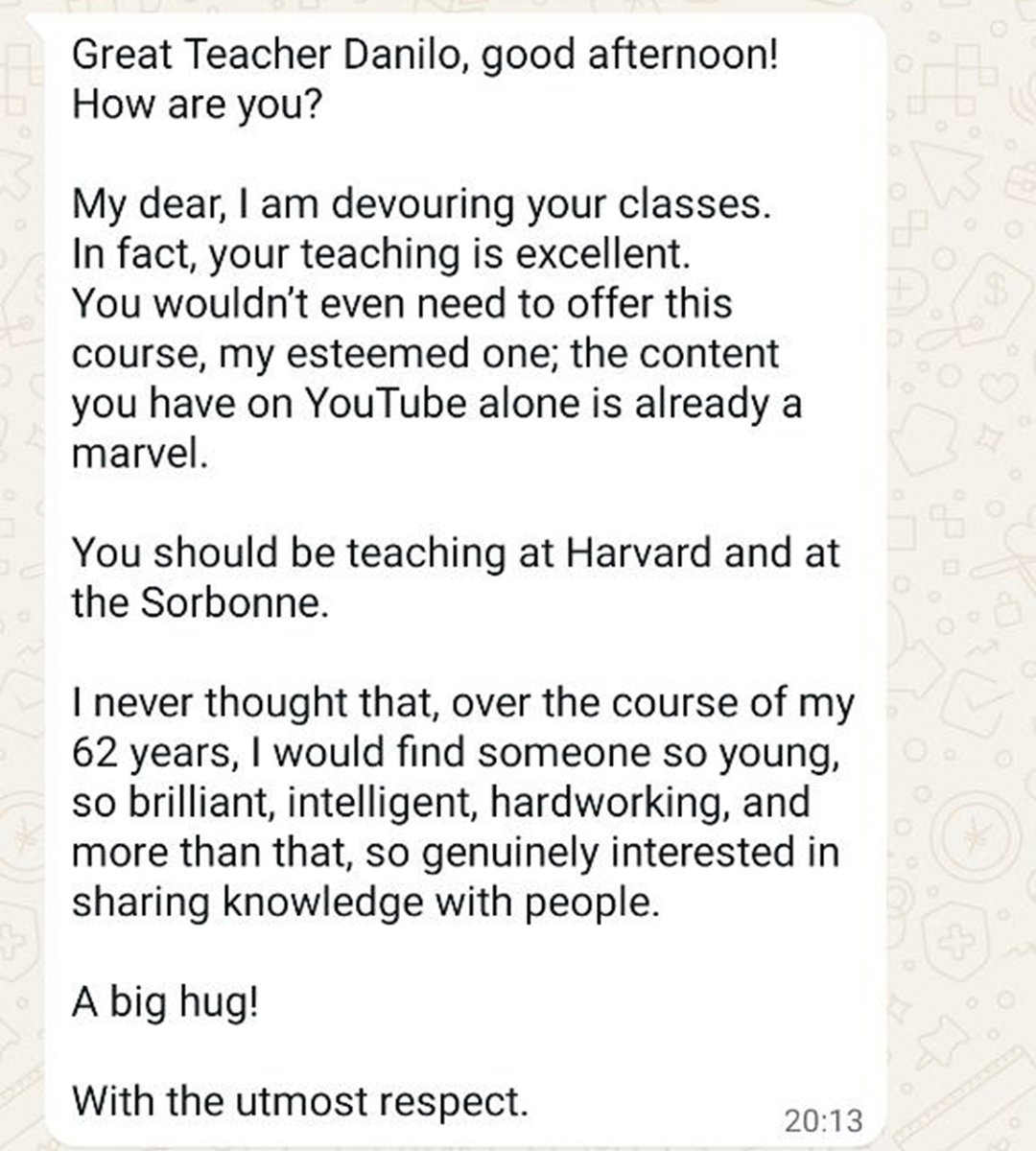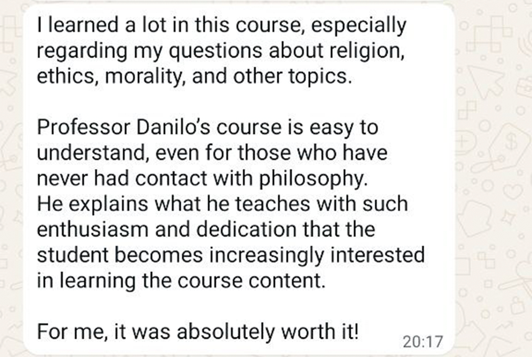 “I study Philosophy at university and it’s very difficult. But in this course by Professor Danilo, the content is rich and easy to understand. His teaching style is engaging and clear, making the learning process flow smoothly.”