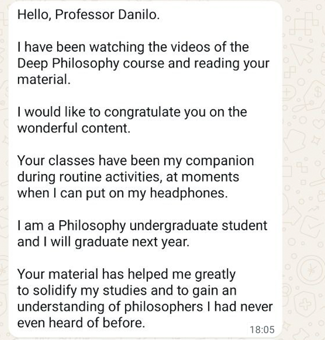 “I started reading Plato on my own and began to have doubts. With Professor Danilo’s course, in the video lessons and in the written material, I have extensive content that makes sense and shows the influences of each philosopher.”